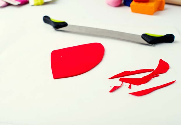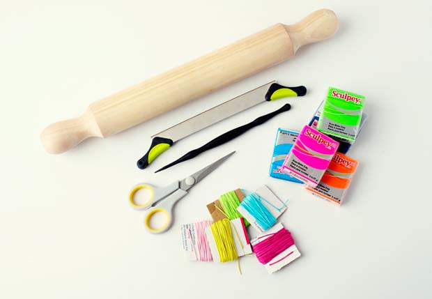 วัสดุอุปกรณ์ : ดินพอลิเมอร์สีต่างๆ, เชือกสี, กรรไกร, มีดตัด, ไม้นวดแป้ง, ไม้เสียบหรือวัสดุแหลมสำหรับเจาะ และ กระดาษรองอบ