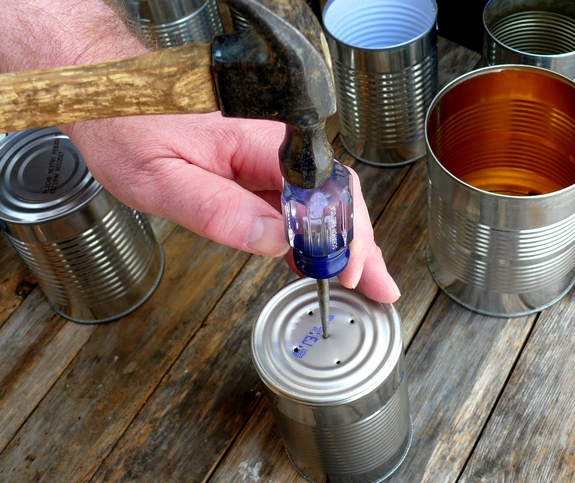 วัสดุอุปกรณ์ : กระป๋องเหลือใช้, สีสเปร์ย, ค้อน, และ เหล็กปลายแหลม