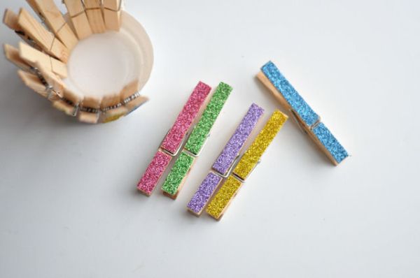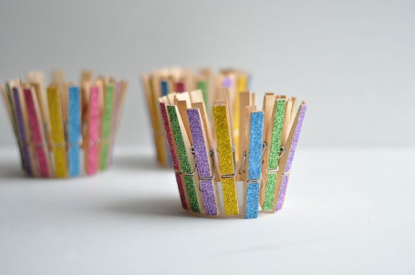 วิธีทำ : เริ่มจากปรับแต่งขนาดและจำนวนของไม้หนีบผ้าให้เข้ากับขนาดของถ้วยพลาสติก เพื่อเวลาหนีบจะได้ไม่เห็นผิวพลาสติกโดยรอบ เพิ่มสีสันลวดลายของไม้หนีบผ้าจากกากเพชรระยิบระยับ หรือ ตัดสติกเกอร์แวววาวติดบนไม้หนีบผ้าตามใจชอบ หรือจะโชว์สีเนื้อไม้ตามธรรมชาติก็ได้ จากนั้นนำไม้หนีบผ้ามาหนีบโดบรอบถ้วยพลาสติก และประดับพรรณไม้ได้เลย
