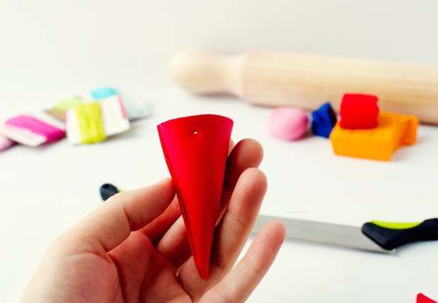 วิธีทำ : เริ่มจากปั้นดินพอลิเมอร์เป็นก้อนยาวพอประมาณ แล้วใช้ไม้นวดแป้งนวดดินพอลิเมอร์เป็นแผ่น ใช้มีดตัดทำเป็นรูปทรงโคน จากนั้นม้วนให้ปลายสองด้านให้ประกบติดกัน เจาะรูเล็กๆ 2 รู สำหรับร้อยเชือก จากนั้นนำใส่เตาอบเพื่ิอใช้ความร้อนทำให้ดินอยู่ตัวเข้ารูป เสร็จแล้วจึงร้อยเชือกสี แล้วประดับต้นไม้ตามใจชอบ