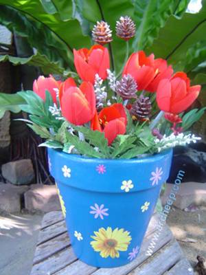 วิธีทำ : เริ่มจากเลือกลวดลายผ้าตามใจชอบ แล้วตัดผ้าให้ได้ขนาดตามกระถางดินเผา ให้สามารถพันกระถางได้โดยรอบและเว้นส่วนของผ้าด้านบนให้สามารถพับเป็นขอบกระถางได้ จากนั้นทากาวอเนกประสงค์ลงบนกระถางในทั่ว แล้วนำผ้าที่ตัดได้ขนาดพอดีมาพันรอบกระถาง ทิ้งไว้ให้กาวแห้ง เท่านี้ก็จะได้กระถางต้นไม้่สวยหวานจากลายผ้าแล้วค่ะ ^^