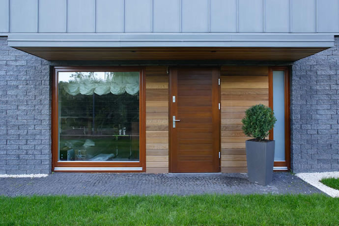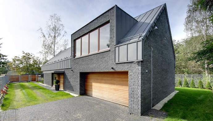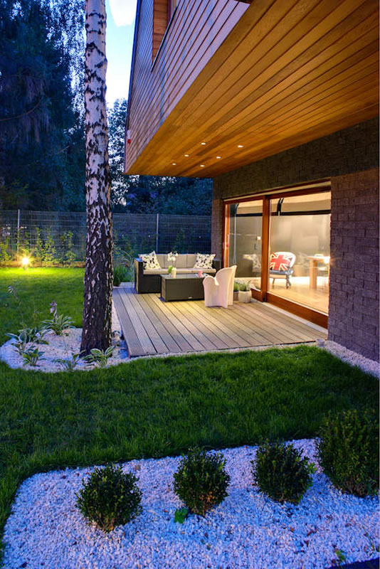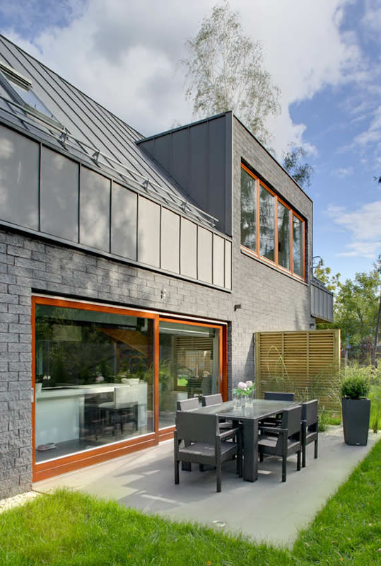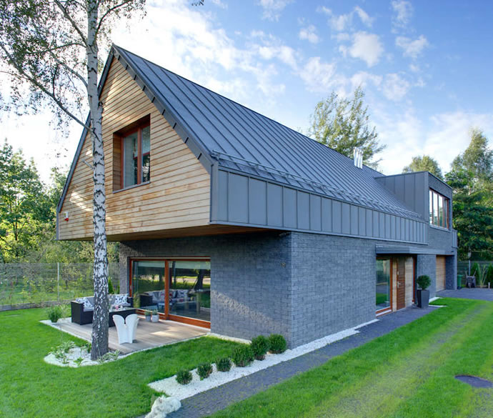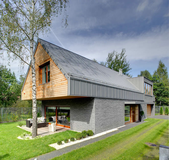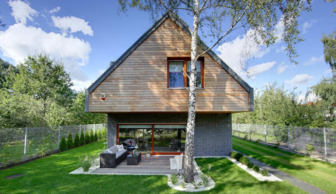 วันนี้โฮมเดคพามาชมบ้านสไตล์สวยเก๋ พื้นที่ขนาด 600 ตารางเมตร อยู่ที่ประเทศโปแลนด์ เป็นบ้านสองชั้นที่มีผนังด้านนอกเป็นไม้ที่ชั้นบนและเป็นอิฐบล็อคที่ชั้นล่าง นอกจากนี้ตัวบ้านชั้นบนออกแบบเป็นทรงสามเหลี่ยม ทำให้ดูโดดเด่นสวยงาม บริเวณสวนรอบบ้านตกแต่งในแบบเรียบง่ายด้วยสนามหญ้ากับพุ่มไม้ขนาดเล็กเป็นหย่อมๆ และต่อเติมลานพักผ่อนด้านหน้าเป็นพื้นที่นั่งเล่นสบายๆ ความสวยเรียบง่ายของตัวบ้าน ความเขียวขจีของสวนและท้องฟ้าที่สวยสดใส ช่างเป็นบรรยากาศที่ผ่อนคลายในเวลากลางวันจริงๆ