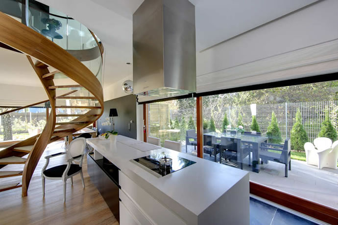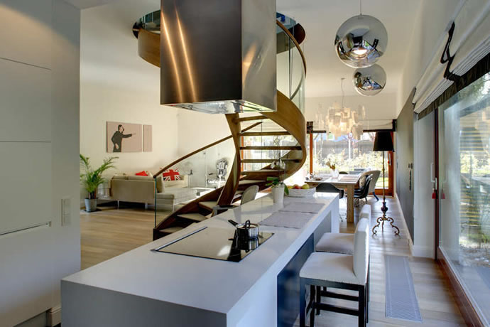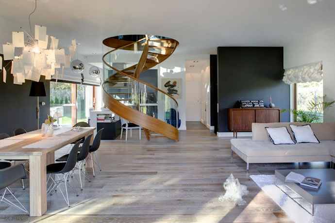 สำหรับการตกแต่งภายในบ้านนั้นแต่งด้วยสไตล์โมเดิร์น จุดเด่นคือบันไดวนที่เชื่อมต่อระหว่างชั้นบนและชั้นล่าง ผนังและเพดานบ้านเป็นผนังปูนทาด้วยสีขาว ส่วนพื้นเป็นพื้นไม้สีอ่อน ช่วยให้ดูสบายตา ไม่สว่างจ้าจนเกินไป