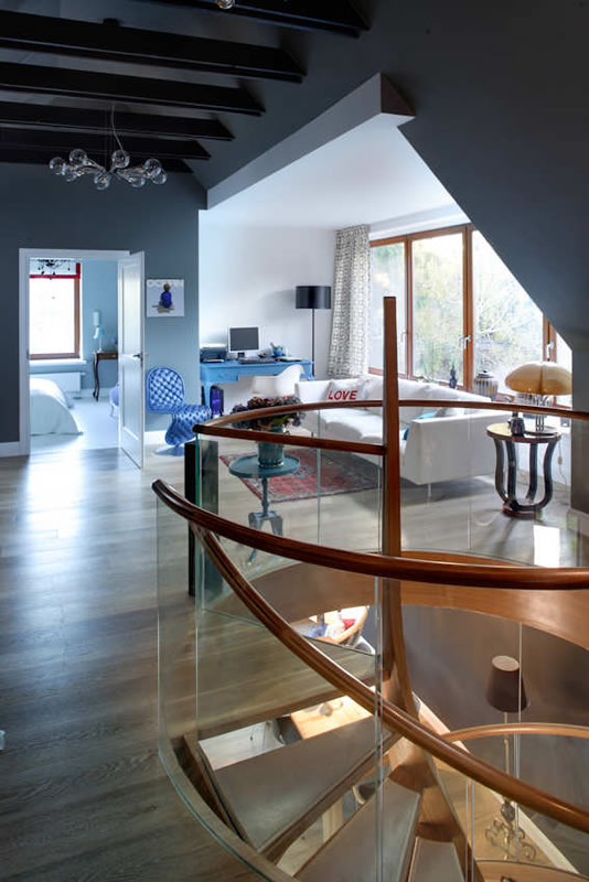ส่วนของห้องนอนและห้องนั่งเล่นบริเวณชั้นบน ตกแต่งออกมาดูอบอุ่นน่าอยู่ เป็นเพราะชั้นบนเพดานเตี้ยกว่าเดิม การใช้กระจกบานใหญ่เปิดรับแสงจากภายนอกจะช่วยให้ห้องดูโปร่งโล่งขึ้น