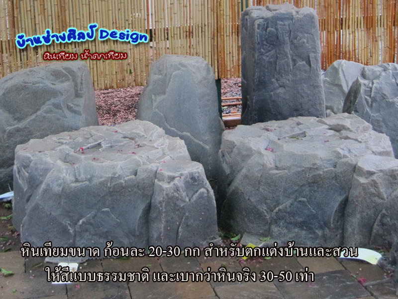 หินเทียม หรือหินสังเคราะห์ เป็นหินผลิตที่หล่อแบบมาจากคอนกรีตน้ำหนักเบามีองค์ประกอบหลักๆ ได้แก่ อครีลิคเรซิน และ อลูมิเนียมไตรไฮเตรท บางชนิดจะมีการผสมเกล็ดหินแท้และผสมสีลงไปเพื่อความสวยงามอย่างเป็นธรรมชาติ ปัจจุบันนิยมนำหินเทียมมาตกแต่งทั้งภายในและภายนอกบ้าน ไม่ว่าจะเป็นการประดับตกแต่งสวน หรือใช้เป็นส่วนประกอบของตัวบ้าน ถึงแม้หินเทียมจะไม่ทนทานเท่ากับหินแท้ๆเช่น พวกหินแกรนิต และมีราคาค่อนข้างสูง แต่คนส่วนใหญ่นิยมใช้ เพราะเป็นการอนุรักษ์ธรรมชาติ ไม่ทำลายทรัพยากรธรรมชาติ และมีความสวยงามไม่ต่างจากหินแท้เลยค่ะ
