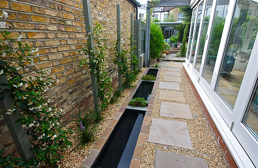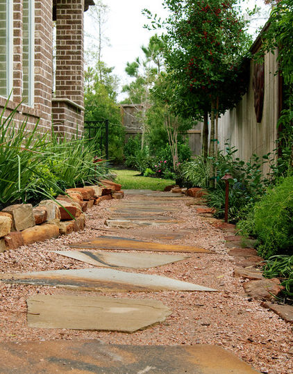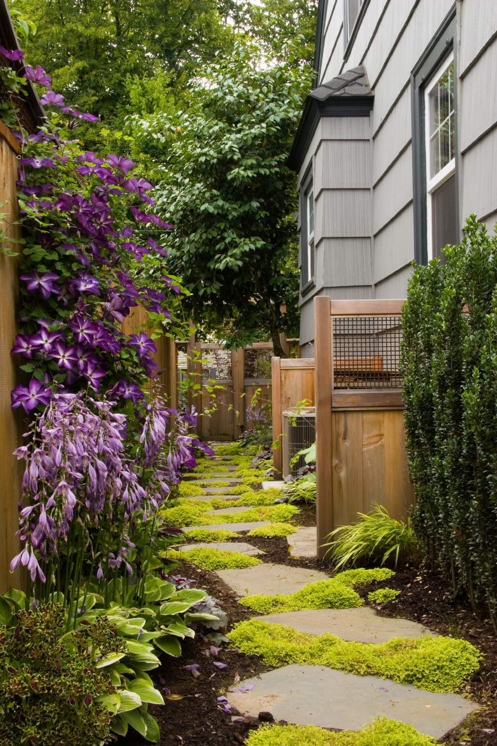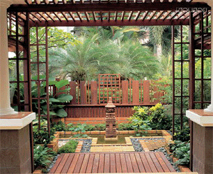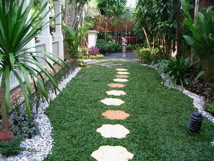 การออกแบบเค้าโครงสวนโดยเฉพาะบ้านเดี่ยวจะถูกออกแบบให้มีบริเวณสวนล้อมรอบตัวบ้าน แต่บริเวณด้านข้างตัวบ้านนั้นจะเป็นพื้นที่ว่างไว้สำหรับทางเดินเชื่อมระหว่างหน้าบ้านและหลังบ้าน หากบ้านคุณมีพื้นที่ด้านข้างตัวบ้านแล้ว อย่าปล่อยว่างไว้โดยไม่ทำอะไรเลยค่ะ เพื่อสร้างความร่มรื่น สร้างบรรยากาศความเป็นธรรมชาติ คุณสามารถใช้พื้นที่บริเวณนี้จัดสวนข้างบ้านได้หลากหลายรูปแบบ ไม่ว่าจะเป็น การจัดเป็นสวนหย่อมเล็กๆ มีไม้กระถาง ไม้พรรณเล็ก มีบ่อน้ำพุเล็กหรือบ่อน้ำตก ทำเป็นมุมนั่งพักผ่อนสบายๆ หรือจัดสวนข้างบ้านให้เป็นทางเดินสวยๆสำหรับบ้านที่มีพื้นที่น้อย ให้เชื่อมพื้นที่ในสวนโดยการปูทางเดินด้วยอิฐ กระเบื้อง หรือกรวดหินต่างๆ แล้วแต่งพุ่มไม้เล็กๆไว้ชิดริมทางเดินต่อเป็นทางยาว หรือแต่งสวนเล็กๆไว้มุมใดมุมหนึ่ง ให้มีสีเขียวของใบไม้ สีสวยของดอกไม้ และไอเย็นจากน้ำ หากจะปลูกต้นไม้ขนาดใหญ่เพื่อเพิ่มร่มเงา ควรตัดแต่งกิ่งต้นไม้ให้ดูโปร่ง สลับกับปลูกดอกไม้เพิ่มสีสัน ก็ให้ความเป็นธรรมชาติเช่นกันค่ะ