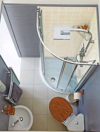 ห้องน้ำ เป็นส่วนประกอบสำคัญของบ้านที่ขาดไม่ได้ สมาชิกทุกคนในบ้านต่างต้องมีเวลาเป็นส่วนตัวในห้องน้ำ เพื่อผ่อนคลาย เพิ่มความสดชื่น วันนี้โฮมเดครวบรวมแบบห้องน้ำขนาดเล็ก ใช้งานได้สะดวกครบครัน แม้จะอยู่ในพื้นที่ใช้สอยบริเวณจำกัด คือ การทำห้องน้ำแบบประหยัด นั่นเอง ขึ้นชื่อว่าประหยัด สิ่งแรกคือ การใช้พื้นที่ห้องน้ำอย่างคุ้มค่า ภายในห้องสี่เหลี่ยมผืนผ้า สามารถแบ่งเป็น 3 ส่วนหลัก ได้แก่ อ่างล้างมือ ชักโครก และ ฝักบัว หากต้องการแยกเป็นส่วนเปียกกับส่วนแห้ง บริเวณฝักบัว ให้ทำเป็นตู้กระจกกั้น หรือทำเป็นม่านกั้น และให้พื้นมีความต่างระดับกัน