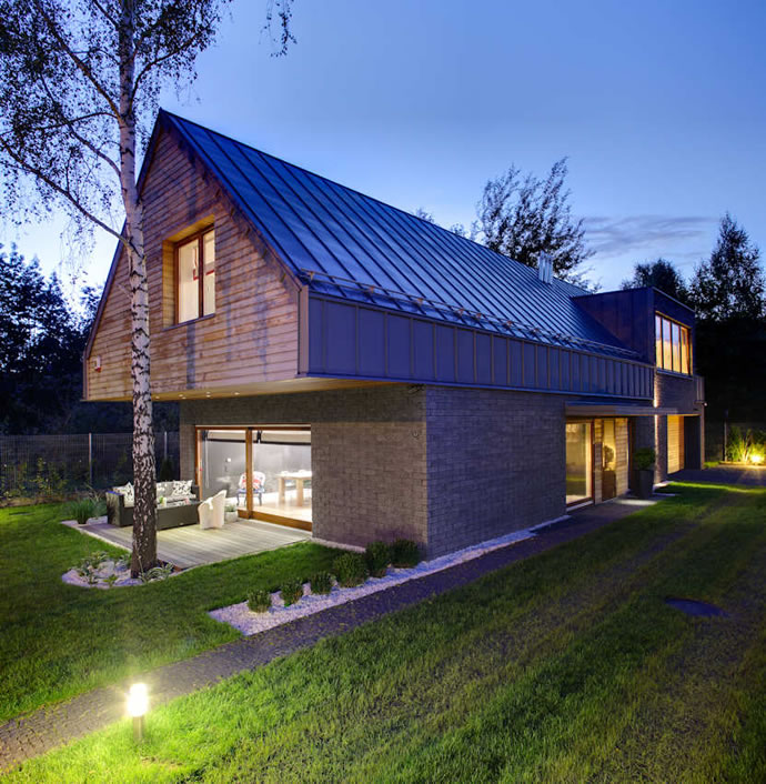 วันนี้โฮมเดคพามาชมบ้านสไตล์สวยเก๋ พื้นที่ขนาด 600 ตารางเมตร อยู่ที่ประเทศโปแลนด์ เป็นบ้านสองชั้นที่มีผนังด้านนอกเป็นไม้ที่ชั้นบนและเป็นอิฐบล็อคที่ชั้นล่าง นอกจากนี้ตัวบ้านชั้นบนออกแบบเป็นทรงสามเหลี่ยม ทำให้ดูโดดเด่นสวยงาม บริเวณสวนรอบบ้านตกแต่งในแบบเรียบง่ายด้วยสนามหญ้ากับพุ่มไม้ขนาดเล็กเป็นหย่อมๆ และต่อเติมลานพักผ่อนด้านหน้าเป็นพื้นที่นั่งเล่นสบายๆ ความสวยเรียบง่ายของตัวบ้าน ความเขียวขจีของสวนและท้องฟ้าที่สวยสดใส ช่างเป็นบรรยากาศที่ผ่อนคลายในเวลากลางวันจริงๆ