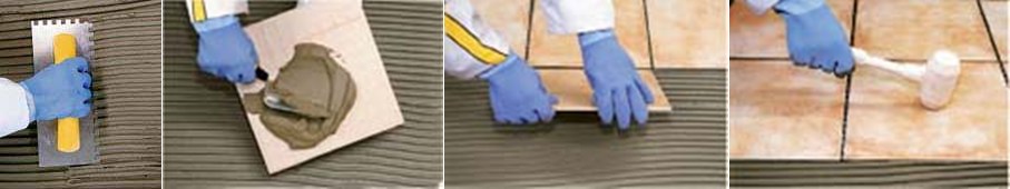 ปูกระเบื้องลงบนกาวซีเมนต์และกดให้แน่น หรือใช้ค้อนยางเคาะบนกระเบื้องให้ทั่ว เพื่อให้ร่องของกาวซีเมนต์ที่แผ่นกระเบื้องกดทับประสานกันอย่างทั่วถึง เว้นช่องว่างระหว่างกระเบื้องแต่ละแผ่น เพื่อให้เป็นร่องยาแนว (อย่างน้อย 2 มม.)