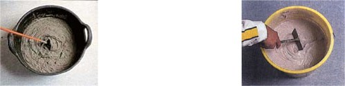 (4 ส่วน) ลงในน้ำ คนให้ทั่วจนเข้าเป็นเนื้อเดียวกัน หรือ 1 : 2.5 โดยปริมาตร (น้ำ 1 ส่วน ยาแนว 2.5 ส่วน)