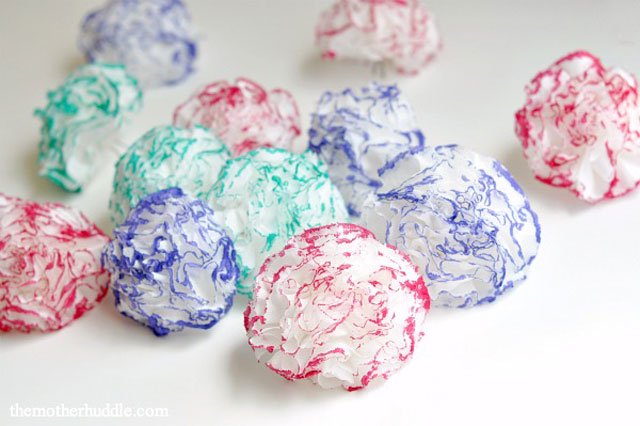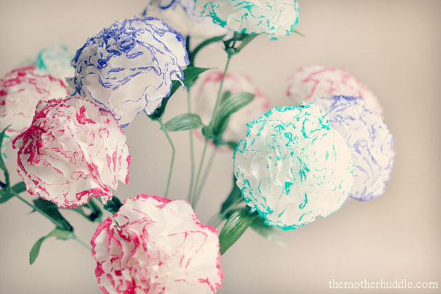 ดอกคาร์เนชั่นหลากสีจากกระดาษทิชชู เริ่มจากใช้กระดาษทิชชูประมาณ 2-4 แผ่น มาพับทบกัน แล้วหนีบแบ่งครึ่ง ตัดความกว้างด้านซ้าย-ขวา ประมาณ 2 นิ้ว หรือแล้วแต่ขนาดดอกที่คุณต้องการ จากนั้นแต่งแต้มสีสันที่ขอบกระดาษด้วยปากกาสี แล้วค่อยดึงดอกแต่ละชั้นออกเบาๆ เมื่อได้รูปทรงเป็นดอกฟูแล้ว นำตัวหนีบออกแล้วมัดดอกกับก้าน พันเทปกาวให้แน่น ติดใบสำเร็จรูป เป็นอันเรียบร้อย จะได้ดอกคาร์เนชั่นสวยเก๋ ไม่ซ๋ำแบบใครแล้วค่ะ