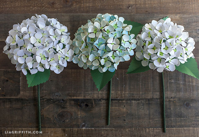 ไอเดียประดิษฐ์ดอกไฮเดรนเยียจากกระดาษ เริ่มจากร่างแบบดอกไฮเดรนเยีย จากนั้นตัดกระดาษให้เป็นรูปตามแบบ แล้วทาสีน้ำอ่อนๆ มัดก้านรวมกันช่อละ 30 ก้าน ความยาวก้านประมาณ 12 นิ้ว แล้วติดกาวดอกกับก้าน จากนั้นประกอบใบเป็นฐานใต้ดอก