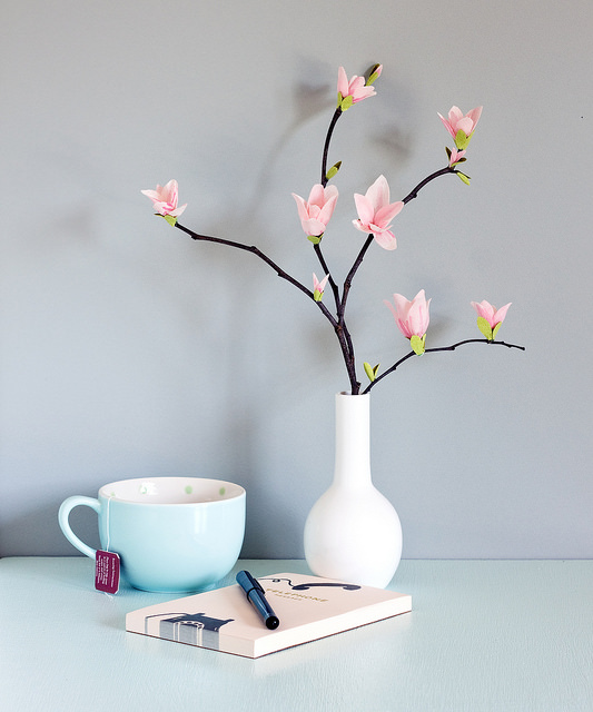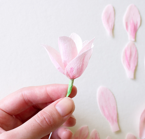 ดอกแมกโนเลียน่ารักๆแบบนี้ ประดิษฐ์จากกระดาษย่นค่ะ ใช้กระดาษย่น 3 สี คือ สีขาว สีชมพูอ่อน และสีเขียว กระดาษกาว สีน้ำและกิ่งไม้ เริ่มจาก ตัดกระดาษย่นขนาดประมาณ 8-12 นิ้ว แล้วทาสีน้ำเป็นแฉก ให้ได้รูปทรงของกลีบดอกไม้ ตัดกลีบขนาดประมาณ 2-2.5 นิ้ว นำมาพันเป็นดอกจำนวน 6 กลีบ/ดอก จากนั้นพันเทปกาวกับลวดอ่อน แล้วดัดติดกับกิ่งไม้ ปักแจกันประดับสวยหวาน ดูโรแมนติก