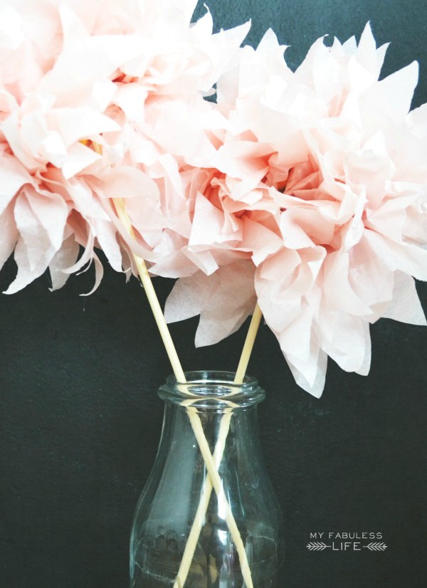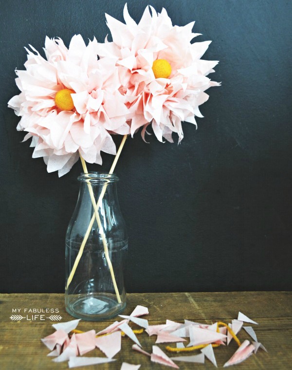 กระดาษทิชชูสีชมพูที่ใช้ในชีวิตประจำวัน นำมาทำเป็นดอกไม้ประดับแจกันได้ไม่ยากเลยค่ะ โดยเลือกใช้กระดาษเช็ดหน้าที่เป็นทรงสี่เหลี่ยมผืนผ้า นำมาทบกันประมาณ 8-10 แผ่น พับทบกันแล้วตัดแบ่งครึ่ง จากนั้นตัดให้เป็นปลายแหลมหัว-ท้าย ใช้ไหมพรมมัดแบ่งครึ่งตรงกลาง แล้วค่อยๆขยายกระดาษออกเป็นชั้นๆ ให้ได้รูปทรงดอกตามต้องการ (ขั้นตอนนี้ ระวังกระดาษขาดด้วยนะคะ)