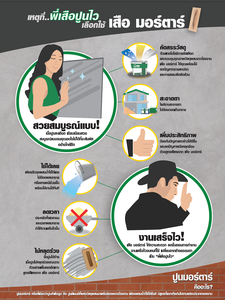 จากการคัดสรรและควบคุมคุณภาพวัสดุผสมจากโรงงาน “เสือ มอร์ตาร์” คลายกังวลเรื่องงานปูน คุณภาพทราย และการผสมผิดสัดส่วน พร้อมเพิ่มประสิทธิภาพด้วยสารพิเศษ ที่จะช่วยเพิ่มคุณสมบัติให้กับเนื้อปูน อาทิ เพิ่มแรงยึดเกาะช่วยให้ผนังไม่หลุดร่วง เพิ่มสารอุ้มน้ำช่วยให้ฉาบง่าย เพิ่มสารลดโอกาสแตกร้าวช่วยให้ผนังสวยสมบูรณ์แบบ สร้างความสะดวกสบายให้ผู้ใช้งาน ลดความสิ้นเปลืองวัสดุ ลดแรงงาน และลดขั้นตอนการทำงาน เพียงฉีกถุงผสมน้ำใช้ได้เลย ไม่ต้องผสมทรายหรือสารเคมีช่วยอื่น สามารถใช้งานได้ทันที ทำให้ประหยัดเวลา ช่วยให้งานเสร็จไวขึ้น