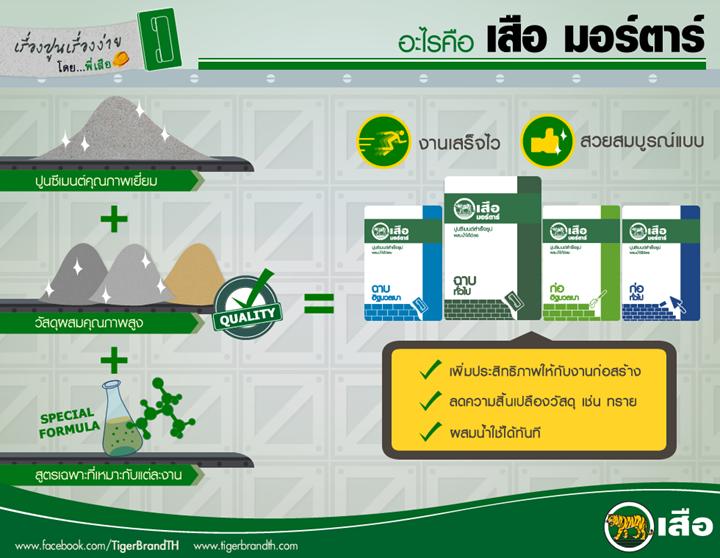 “เสือ มอร์ตาร์” คือ ปูนซีเมนต์สำเร็จรูป เกิดจากการผสมปูนซีเมนต์คุณภาพเยี่ยม ร่วมกับวัสดุผสมคุณภาพสูงผสมมาเสร็จสรรพจากโรงงาน เพียงผสมน้ำก็ใช้ได้ทันที มีสูตรเฉพาะที่แตกต่างกันไปตามประเภทของงาน จะช่วยตอบสนองความต้องการด้วยงานที่ว่องไว เนื้อสัมผัสที่สมบูรณ์แบบ เป็นที่พอใจของทั้งช่างก่อสร้างจนถึงความพอใจของผู้อยู่อาศัยได้อย่างดี