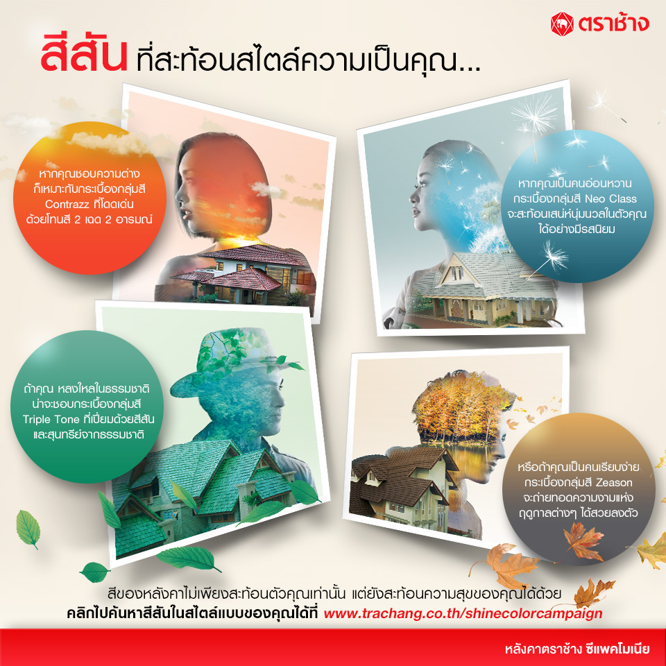 สีของหลังคาจึงนอกจากจะสะท้อนสไตล์และตัวตนของคุณให้คนอื่นได้รับรู้แล้ว  ยังเป็นการสะท้อนความสุขของตัวคุณเองที่ได้เห็นบ้านที่มีหลังคาสีสันสวยงามสมจริง คุณสามารถเข้าไปเลือกค้นหาสีสันในสไตล์แบบของคุณได้ที่ >> trachang.co.th/shinecolorcampaign